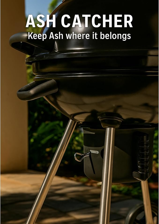 This unit features two nylon handles reinforced with fiberglass for strength and heat resistance, a steel cooking grill with triple nickel plating for durability and corrosion protection, and aeration valves with an aluminum ashtray to ensure efficient airflow and easy ash removal.